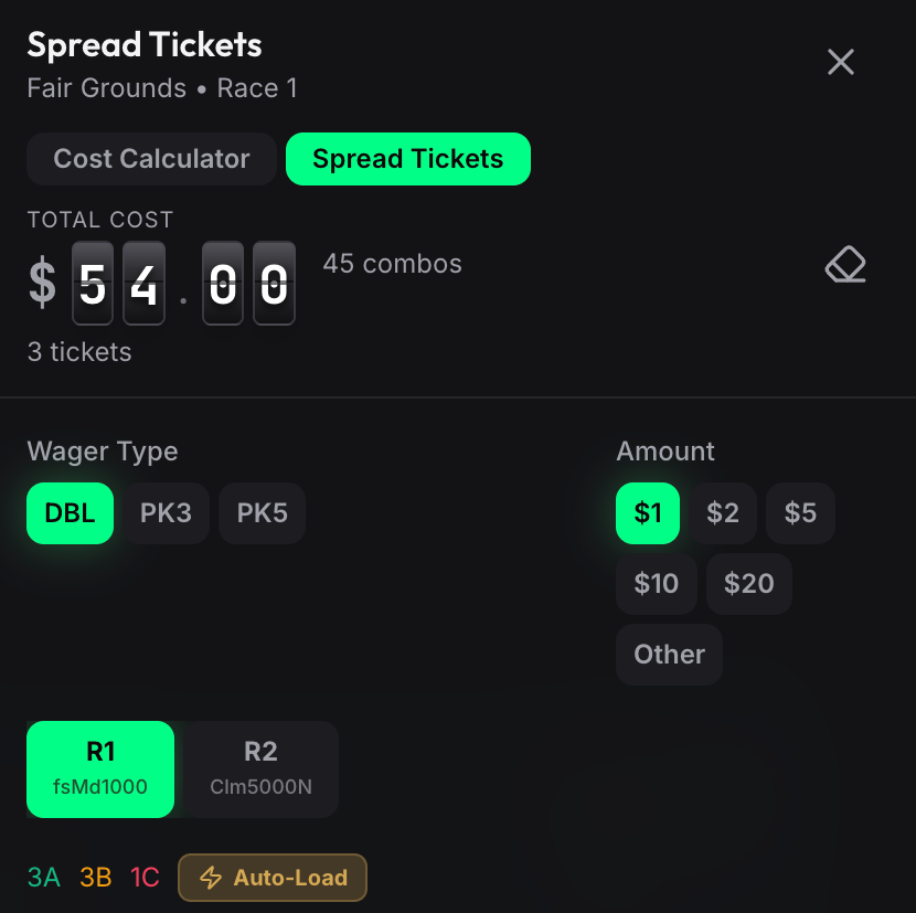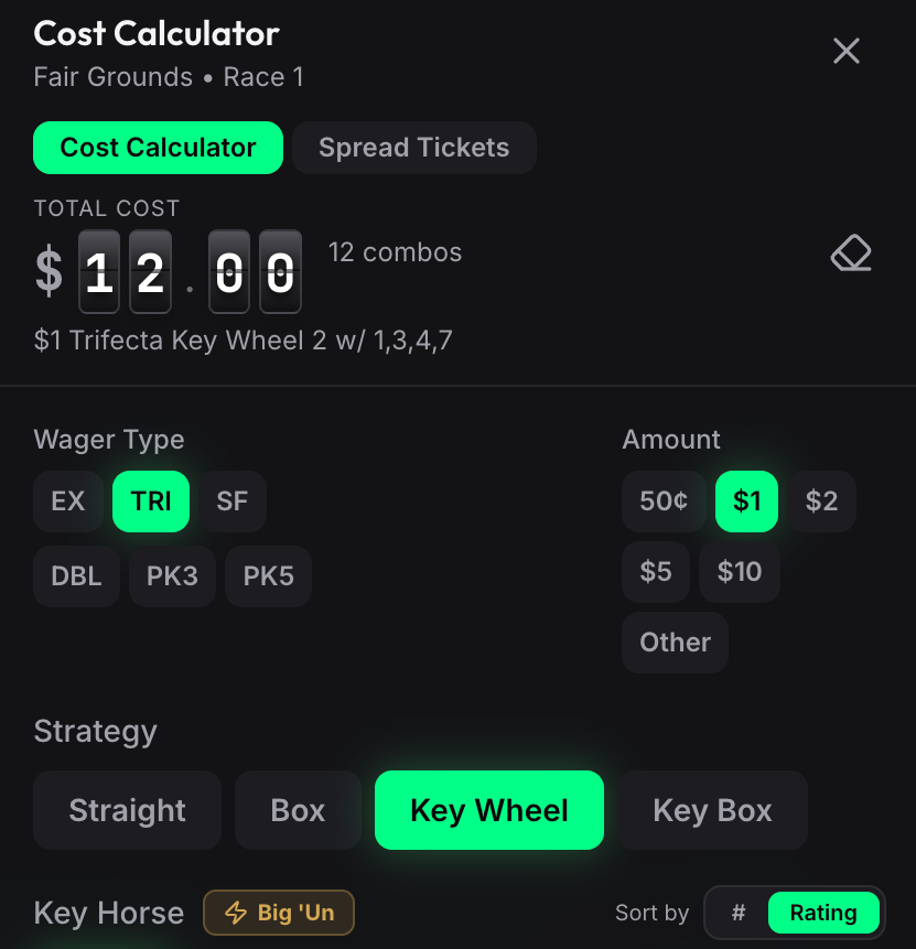 Calculate the exact cost of any exotic wager before placing your bet. Supports all wager types (Exacta through Pick 9) and all strategies (Straight, Box, Key Box, Key Wheel). Horse names and tier badges are pulled directly from the form. The Big 'Un button auto-fills selections using our tier-based strategy.