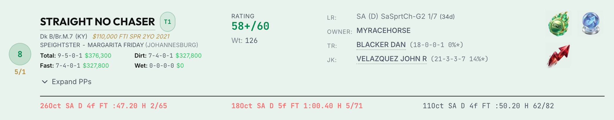 | Has Improved - This horse has shown measurable improvement in its recent races, based on our analysis of speed figures, running style, and finishing position. An improving horse is dangerous because it may not have peaked yet. | |