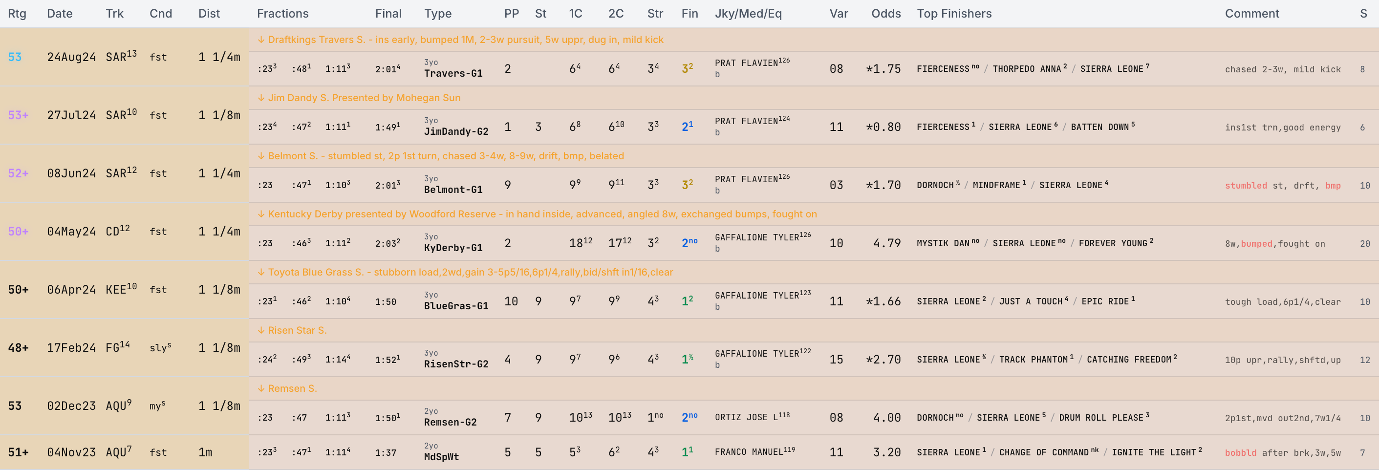 - Trip Comment - Description of the horse's trip. Negative trip factors are highlighted, indicating trouble (stumbled, bumped, wide, blocked, etc.)