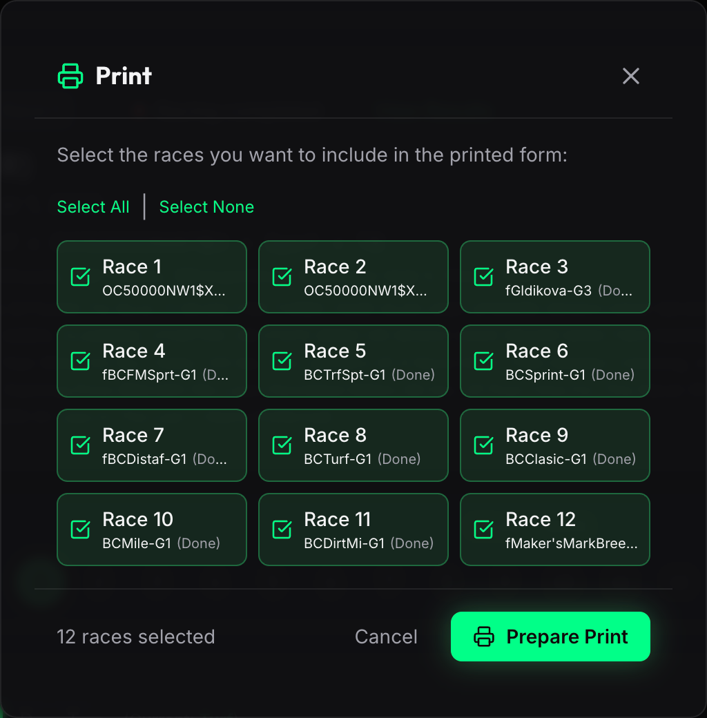- Prepare Print loads past performance data and generates a clean, landscape-formatted printout optimized for paper — great for taking to the track or OTB.