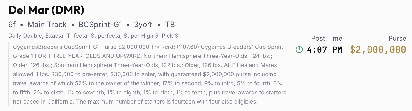- Purse - The total prize money for the race