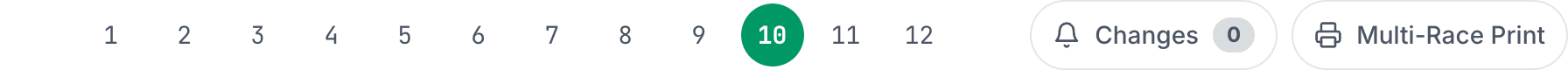The race selector bar sticks to the top of the screen as you scroll. Numbered buttons let you jump to any race on the card. Hover over a race number to see a quick preview of the post time, classification, distance, surface, and purse. The currently selected race is highlighted.