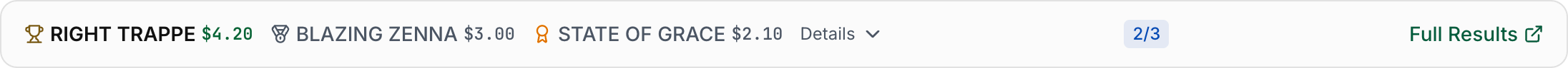 Once a race is official, a results bar appears at the top of the race. It shows the top three finishers with their Win, Place, and Show payoffs, along with an accuracy badge indicating how many of our top 3 rated horses finished in the actual top 3 (e.g., "2/3"). Click Details to expand the full results table with every finisher's position and our predicted rank, plus Win/Place/Show payoffs and exotic payouts (Exacta, Trifecta, etc.) — or click Full Results to jump to the dedicated results page for that race card.