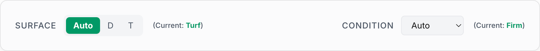 - Surface - Choose between Auto, Dirt, Turf, or Synthetic. "Auto" uses the race's scheduled surface. The current official surface is shown in gold.