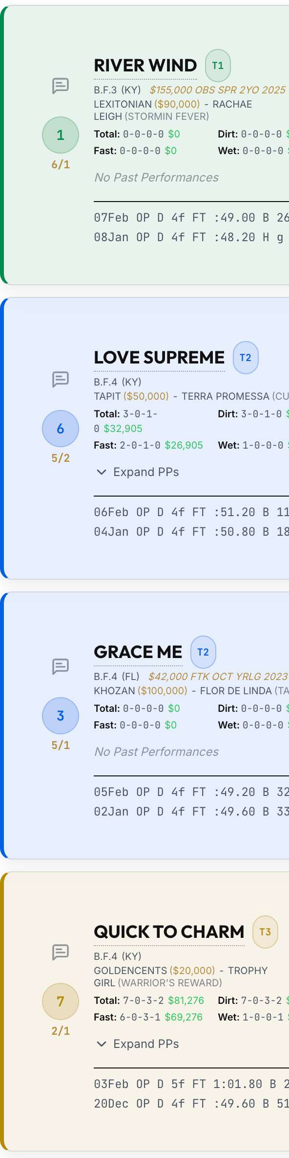 - Tier 1 (Dark Green) - Our top-rated horses. Key or box these for single-race exotics, or use them as singles in multi-race bets.